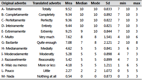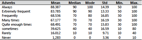 As one can see (Table 5), the adverbs that indicate extreme positive or negative intensities have a more precise evaluation, with less dispersion; those in the middle of the scale are less precise and are more disperse. The same occurred with the frequency adverbs. This is a result compatible with theories on psychological judgement:
