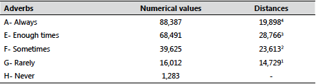 The based on frequency adverbs scales are presented below. A first example of this scale, showing the numerical values of the adverbs and the distance between positions can be observed in Table 9.