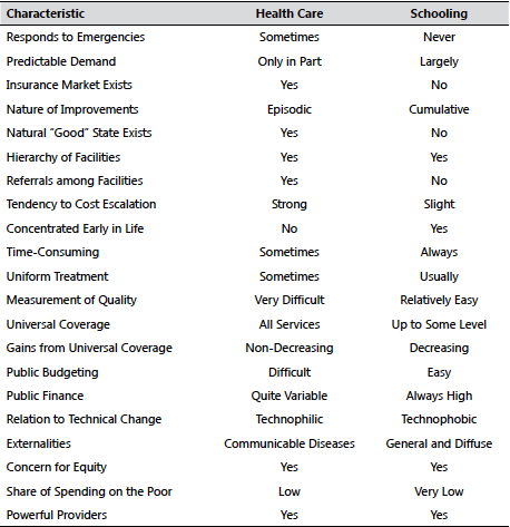 We summarize the arguments for our conclusion in Table. Sometimes there is a clear “Yes” or “No” answer to the question whether health care or schooling exhibit a particular characteristic, but more often there are differences of degree, sometimes very marked between the two. Since it is usually possible to find some similarities and some differences when comparing any two things, comparisons always involve some decisions about emphasizing common features or divergent ones. At one extreme, everything may look so much alike as to paralyze discrimination and analysis. At the other extreme is the character of Funes the Memorious (BORGES, 1980), so overwhelmed by details and minute differences as to be incapable of abstract thought.