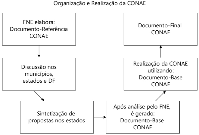 Esse Documento-Base é objeto de discussão durante a CONAE, e o resultado dessa discussão dá origem ao Documento-Final da CONAE. A seguir, é apresentado o fluxo de organização e de realização da CONAE, conforme Figura 1.