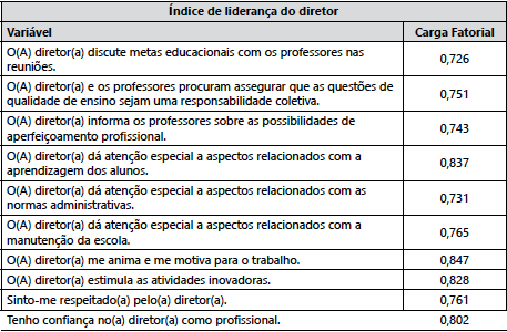 Os índices descritos na seção 3 deste trabalho foram construídos a partir da análise fatorial, com as respostas dadas pelos professores de 5º ano cujas unidades de ensino participaram da Prova Brasil em 2013, no Estado do Rio de Janeiro. Sobre a relação entre as variáveis que compõem os fatores e os nomes dos índices criados, vale ressaltar que a escolha se baseou na literatura sobre liderança e clima escolar e na limitação dos itens disponíveis. Assim, no que se refere ao Índice de Liderança do Diretor, temos questões que abrangem as relações pessoais entre professores e diretores e outras que tratam das iniciativas do diretor relacionadas ao trabalho pedagógico ou administrativo da escola. Neste momento e com estes dados, estas variáveis (que poderiam indicar diferentes perfis de liderança do diretor) se agruparam em um mesmo fator, possivelmente indicando que as respostas do grupo analisado tendem a aproximar características relacionais, pedagógicas e administrativas ao analisar a liderança do diretor. Contudo, cabe ressaltar a limitação destes itens que não abordam todas as dimensões de liderança desempenhadas pelo diretor, mas que possibilitaram criar este Índice que propõe uma medida da percepção do professor sobre a liderança do diretor de uma forma ampla, sem especificar as possíveis tendências desta liderança.