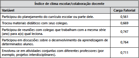 Quanto ao Índice do Clima Escolar, ressaltamos que as variáveis que o compõem não contemplam todos os elementos que constituem o clima de uma escola. Neste caso, o questionário contextual da Prova Brasil traz outros itens relacionados à violência e à disciplina, porém fogem ao escopo deste trabalho. Interessa-nos conhecer qual é a percepção dos professores sobre as relações estabelecidas entre os educadores, com foco na melhoria do trabalho acadêmico. Assim, as variáveis que compõem este índice trazem algumas pistas sobre a coesão e a colaboração entre a equipe, elementos indicadores do clima escolar e geralmente relacionados ao trabalho do diretor, mas não esgotam o tema.