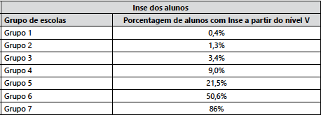 Para operacionalizar este indicador em nosso estudo, tomamos como referência a porcentagem de alunos classificados nos níveis 5, 6 e 7 (em média) que as escolas de cada grupo apresentavam. Dessa maneira, uma escola classificada no Grupo 1, tem, em média, apenas 0,4% de seus alunos apresentando um Inse alto, como pode ser visto no Quadro 3, mais a frente.