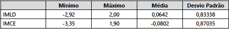 Os dois Índices criados foram então agrupados pela unidade escola, obtendo o Índice Médio para cada instituição de ensino. Nesta seção, passamos a descrever como se comportam o Índice Médio de Liderança do Diretor (IMLD) e o Índice Médio de Clima Escolar/Colaboração Docente (IMCE). No que se refere aos dois índices, quanto maior e positivo o índice, maior o valor médio da percepção dos professores sobre a Liderança do Diretor e o Clima Escolar nas escolas.