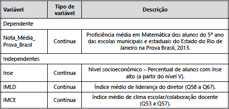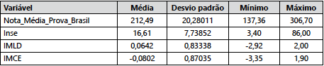 Estatisticamente, esta fórmula representa os fatores que interferem na variação de resultados das escolas na Prova Brasil 2013 (média dos alunos do 5º ano em Matemática): β0 indica a nota média na Prova Brasil (quando Inse, IMLD e IMDE são iguais zero); β1 é o indicador de Inse da escola, utilizado como controle da equação; β2 é o Índice de Liderança do Diretor (média por escola); β3 é o Índice de Clima Escolar/Colaboração Docente; “e” é o erro aleatório, ou seja, representa o resultado médio do aluno na Prova Brasil que não pode ser atribuído nem ao Inse, nem ao IMLD e nem ao IMCE. Os Quadros 5 e 6 apresentam a definição e a estatística descritiva (variação dos valores entre as escolas) destas variáveis.