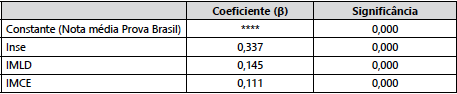 Conforme mostra o Quadro 7, as variáveis que entraram no modelo apresentaram relação significativamente positiva (coeficientes com valor positivo e com significância menor do que 0,001) em relação ao resultado dos alunos do 5º ano na avaliação de Matemática da Prova Brasil 2013. Nesse sentido, o nível socioeconômico dos alunos foi a variável que apresentou a maior relação positiva, em conformidade com os estudos acerca da relação escola e sociedade, mais especificamente no que tange às características socioeconômicas das famílias e às desigualdades educacionais.
