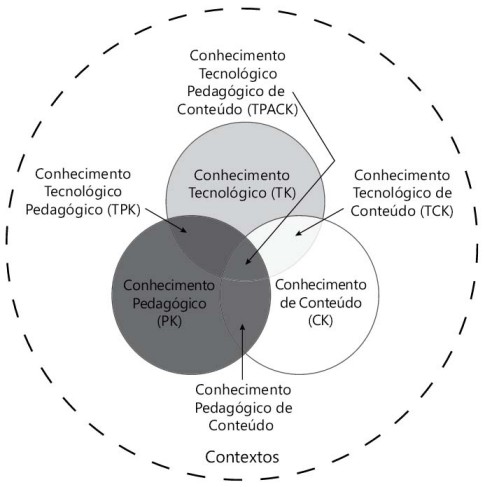 Segundo Mishra e Koehler (2006, p. 1020), “a base deste quadro teórico é o entendimento que o ensino é uma atividade extremamente complexa que recorre a diversos tipos de conhecimentos”. Ensinar eficazmente com tecnologia requer uma compreensão de cada um destes conhecimentos, mas também e, essencialmente, de todas as relações de reforço mútuo entre tecnologia, conteúdo e pedagogia (Figura).