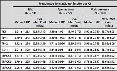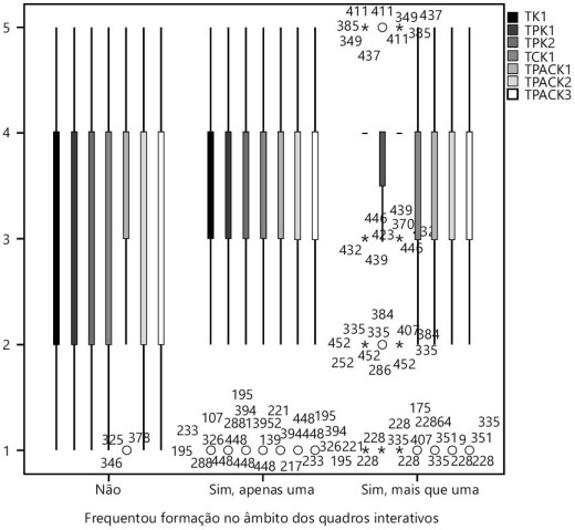 Graficamente as estatísticas descritivas do Quadro 4 podem ser visualizadas num diagrama de extremos e quartis (Gráfico), denotando uma diminuição da dispersão dos resultados e um aumento das médias de cada item do conhecimento tecnológico dos docentes, à exceção do TPACK1, relativamente à frequência ou não em formação em QI no âmbito do PTE. No caso de os docentes terem frequentado mais que uma formação, os itens com menor dispersão e maior média são o TK1 e o TPK2.