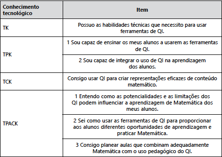 O questionário pretendia avaliar os diferentes tipos de conhecimento tecnológico associados ao TPACK Matemático no caso particular do QI. Era composto por sete itens em escala: um sobre TK, dois sobre TPK, um sobre TCK e três sobre TPACK, em que o conteúdo estava diretamente relacionado com a Matemática (Quadro 1). Os sete itens de opinião respeitaram uma escala de Likert de cinco pontos: 1 – discordo totalmente, 2 – discordo, 3 – não concordo nem discordo, 4 – concordo e 5 – concordo totalmente.
