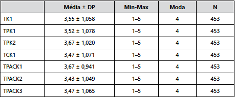 Quanto às médias obtidas para cada item, também se pode verificar uma semelhança das mesmas (Quadro 3), rondando os 3,5 e de DP 1, não se salientando grandes distinções na autoperceção dos docentes face aos vários tipos de conhecimentos tecnológicos relativamente aos QI.