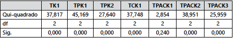 Depois de considerarmos os efeitos da frequência de formação sobre QI no conhecimento tecnológico dos docentes de Matemática é possível afirmar que a formação teve um efeito estatisticamente significativo (p < 0,001) sobre TK1, TPK1, TPK2, TCK1, TPACK2 e TPACK3 (Quadro 5). Verificou-se, através do teste de Levene, que não havia homogeneidade de variância, condição necessária para a aplicação da ANOVA, o que resultou na utilização do teste não paramétrico, o teste de Kruskal-Wallis.