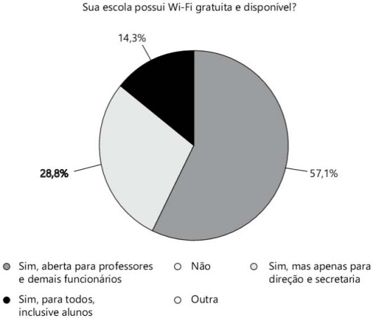 Em relação à abertura da Rede Wi-Fi conforme apontam os dados presentes no gráfico abaixo, está disponível para todos no espaço escolar, houve uma grande surpresa, pois acreditava-se que apenas os gestores e funcionários teriam acesso a essa tecnologia. Ficou evidente que a maioria das escolas, mais de 57,0%, tinha um grande potencial para trabalhar com ferramentas online e multimídias, uma vez que os dispositivos móveis povoam esses ambientes.