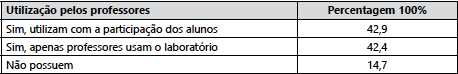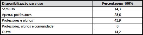 Quando perguntado aos gestores se o Laboratório de Informática era usado nas escolas, é possível visualizar as informações no Quadro 1, destacando que 42,9% dos gestores afirmaram que professores e alunos fazem uso desse ambiente e, em 28,6% dos casos, apenas os professores utilizam essa ferramenta, sem a participação dos alunos; já em 14,3% das escolas investigadas, a comunidade escolar não faz o uso da do laboratório de informática. Na entrevista informal, ficou evidente que as causas para a falta de uso, na maioria dos casos, foram em virtude de fatores como: ausência de um técnico responsável para gerenciar e realizar manutenção do espaço; ambientes pequenos demais para a quantidade de computadores, falta de interesse e conhecimento dos professores para utilizar o laboratório, medo de que os alunos quebrem os computadores.