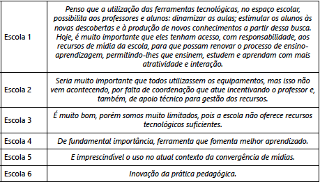 Percebe-se que as respostas, de certa forma, são parecidas. Os gestores justificam a importância das ferramentas tecnológicas, mas alguns admitem a não utilização delas de forma abrangente por inúmeros motivos, um deles é a falta de coordenação para esse fim. Diante disso, vale destacar, mais uma vez, que os professores da Rede Pública de Ensino do Estado da Bahia foram capacitados para utilizar as ferramentas tecnológicas com proficiência. Além disso, muitos alunos podem ajudar os professores, contribuindo para a interação entre docentes e discentes em sala de aula.