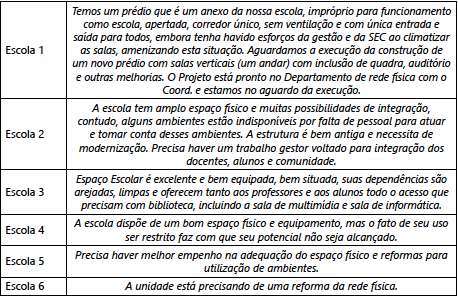 Evidencia-se o quanto essas escolas são heterogêneas em seus espaços físicos. Isso leva a inferir que o Estado não pensa na equidade das escolas, pois essa perspectiva pouco contribui para a formação dos alunos. O que se vê, são alunos de uma mesma região com formação pedagógica muito diferente, sendo que o reflexo dessa situação pode ressoar e ampliar, ainda mais, a desigualdade de aprendizagem.