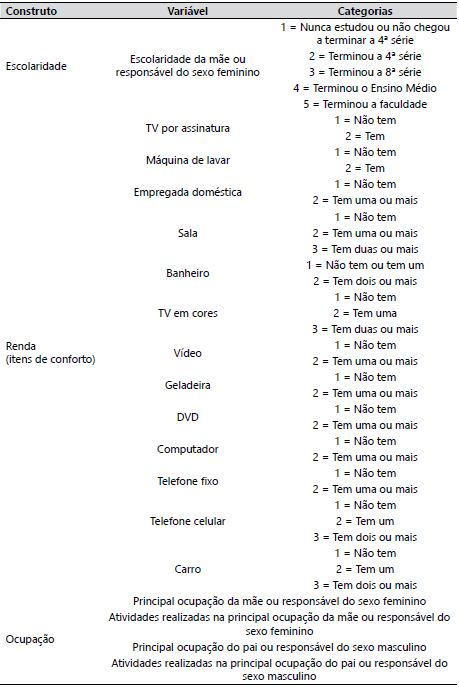 O Geres buscou também agregar informações a respeito dos pais e/ou responsáveis dos alunos para determinar o nível socioeconômico de todos os alunos participantes, o que tem se tornado variável fundamental para a compreensão do percurso de aprendizagem dos alunos. O questionário abrangia questões sobre escolaridade, presença de itens de conforto na residência, endereço, principal ocupação e funções desempenhadas no trabalho pelos pais ou responsáveis dos alunos. A metodologia empregada para o cálculo de nível socioeconômico (NSE) levou em consideração as questões referentes aos seguintes construtos: Escolaridade, Renda e Ocupação. Os construtos, as variáveis e as categorias presentes no questionário de pais e utilizadas no cálculo estão descritas na Tabela 1.