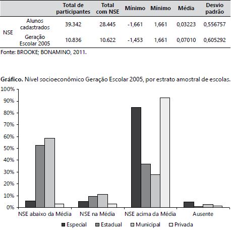 A Tabela 2 revela que o NSE médio da Geração Escolar 2005 se situa ligeiramente acima da média do grupo de alunos participantes como um todo, por não incluir alunos dos níveis socioeconômicos mais baixos. Por sua vez, o Gráfico mostra que os alunos de nível socioeconômico mais baixo se concentram nas escolas públicas, e que os alunos das escolas do estrato especial2 e estrato privado são basicamente os mesmos em termos socioeconômicos.
