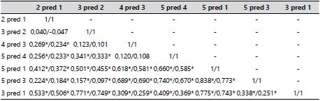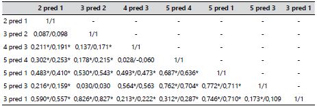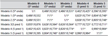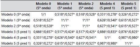 Neste estudo, realizamos uma comparação entre as medidas de VA produzidas pelos modelos de 3 a 5 (considerando as ondas 5 pred 1) com as medidas de VA produzidas pelos modelos de 0 a 2, apenas com o resultado da 5ª onda. As correlações de Pearson e Spearman (que consideram apenas o posto ou a ordem da medida) são reportadas nas Tabelas 3 e 4.