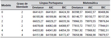Finalmente, uma análise do ajustamento dos modelos por meio de estatísticas de deviance, AIC (Critério de Informação de Akaike) e BIC (Critério Bayesiano de Schwarz), reportada na Tabela 5, sugere que o modelo mais ajustado entre todos é o modelo 4 – de VA, para ambas as disciplinas.