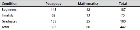 Research focused on groups made up of students and graduates in different situations: a) beginners in the Mathematics and Pedagogy courses who entered in the second semester of 2010 and the first semester of 2011; b) students concluding the same two courses in the first semester of 2012; and c) students that had graduated and left in any one of the five semesters from the 2nd semester of 2010 to the 2nd semester of 2012. Table 1 shows the numbers of students, by course and by condition in the course (undergraduate beginner, undergraduate finalist or graduate).