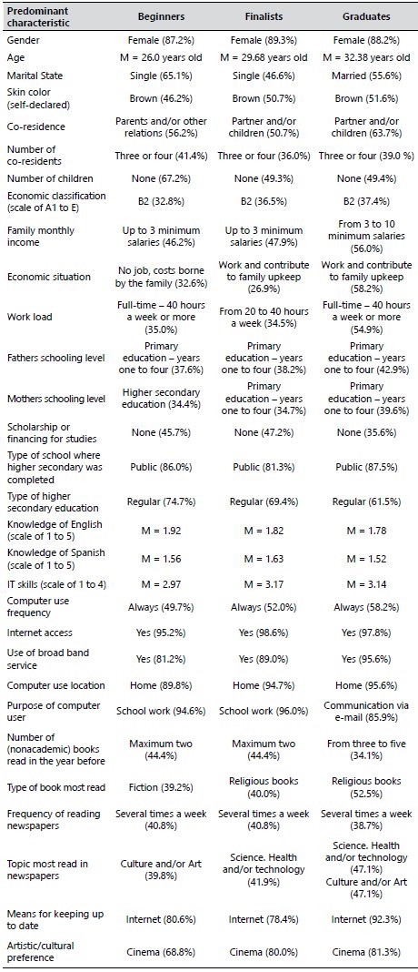 The answers to the questionnaires defined the social-economic-cultural profile of the participants. Table 2 is a synthesis of the predominant features of each group. The results show that survey participants were students from low-income families with very little knowledge of foreign languages, not frequent readers of books or newspapers and with only a timid presence in diversified cultural activities, these last usually being limited to the movies. Most of them had a higher schooling level than their parents. On the other hand, they declared that they had good knowledge of IT and access to the internet – mostly broad-band access. Furthermore, the internet was their main source of information and updating. The economic, social and cultural situation of the final semester students compared to the beginners appeared to be better. Part of the statistics gathered by the survey showed that students in the teaching degree courses had a lower socioeconomic status than those in the Law course (PALAZZO, 2015; PALAZZO; GOMES, 2012). In the social hierarchy of curricula, the qualification of educators appears once more with a relatively low level of social prestige, selected by less privileged people (BELTRÃO; MANDARINO, 2014).