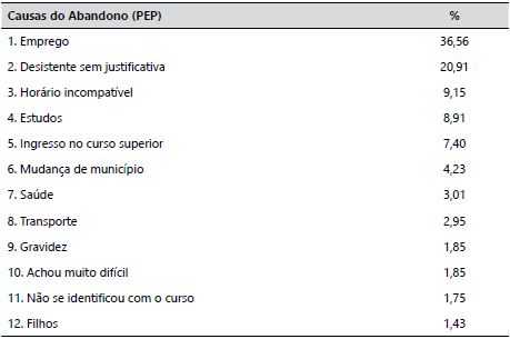 A Tabela registra os motivos de evasão apontados pelo Programa. Segundo os dados recolhidos, os alunos deixam a escola, em primeiro lugar, por motivos de emprego (36,56%). Em seguida, destaca-se a proporção de discentes (20,91%) que não fornecem qualquer justificativa para o abandono. Obviamente, como sinalizado por Dore e Lüscher (2011, p. 784), “é uma frequência muito alta para uma razão tão imprecisa”.