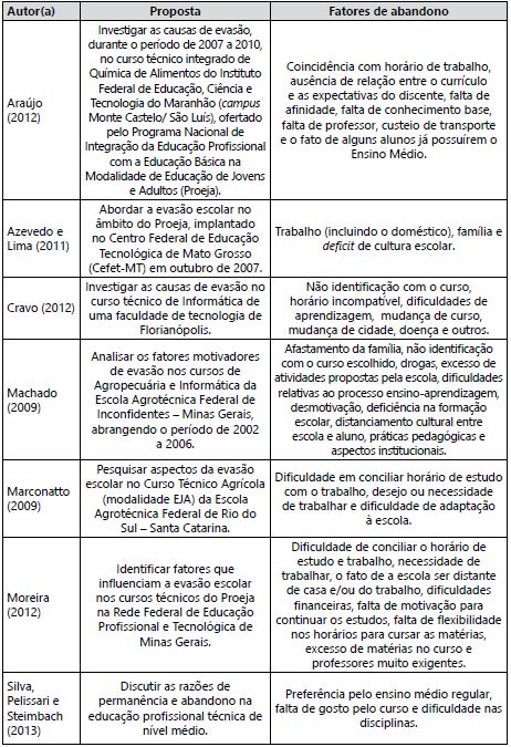 Acrescenta-se ainda o trabalho de Araújo e Santos (2012) que, embora não tenham se dedicado ao estudo empírico da questão, levantaram, por intermédio de pesquisa bibliográfica, causas de evasão no âmbito da Educação Profissional de nível médio, distinguindo fatores internos e externos às instituições escolares. Os primeiros, de acordo com a autora, estão relacionados à questão da escola não atrativa: