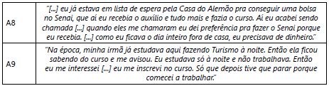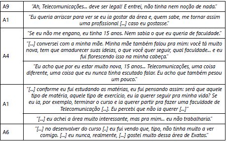 A respondente 9 alegou, inicialmente, que havia abandonado o curso apenas pela proposta de emprego. Ao longo da entrevista, no entanto, foi pontuando diversos problemas que permearam sua trajetória na Instituição, tais como: não identificação com o curso, aulas pouco dinâmicas, dificuldades associadas à falta de conhecimento base, carga horária “puxada” e salas calorentas. Portanto, se for realizada uma análise mais criteriosa a respeito dos motivos que a conduziram ao abandono, será possível concluir que eles foram além do surgimento de uma oportunidade mais “vantajosa”.