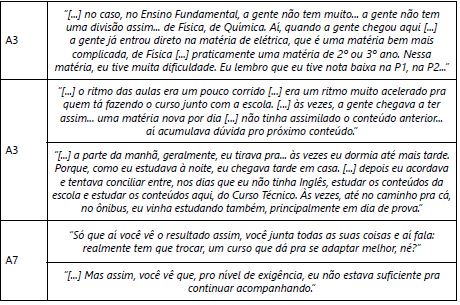 Alguns evadidos relataram se sentirem aflitos quanto aos obstáculos que enfrentariam a partir da conclusão do primeiro período. Esse sentimento provinha dos relatos de seus amigos que já cursavam o período subsequente e expressavam-se, constantemente, a respeito das dificuldades por eles vivenciadas. O quadro 6 expõe trechos de falas que favorecem essa análise.