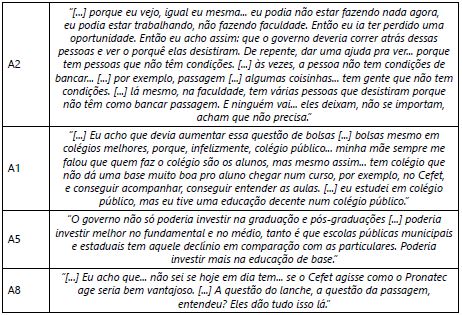 As colocações dos respondentes não são desprovidas de sentido. Algumas dessas reflexões foram feitas por pesquisadores que buscaram também compreender os motivos pelos quais os alunos não concluem seus estudos nos cursos técnicos. Araújo e Santos (2012) ressaltaram a ausência de políticas públicas consistentes e a efetivação das políticas já existentes como um fator externo de evasão escolar na educação profissional de nível médio, alertando quanto ao número reduzido de projetos que têm por objetivo favorecer a permanência dos alunos nas instituições.