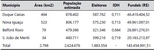 Nessa direção, o primeiro dado a ser aqui destacado diz respeito às dimensões populacionais da Baixada Fluminense, uma região formada por 13 municípios da Região Metropolitana do Rio de Janeiro. A população aí concentrada é aproximadamente de 3,6 milhões de pessoas, conforme estimativas baseadas no censo brasileiro de 2013 (IBGE, 2013). Duque de Caxias, Nova Iguaçu, Belford Roxo e São João de Meriti são os municípios mais populosos da Baixada, os dois primeiros próximos da casa dos 800 mil habitantes e os dois últimos com aproximadamente 500 mil habitantes. Compostos com outros dados como o número de eleitores (TSE, 2013), o IDH – Índice de Desenvolvimento Humano (IBGE, 2013) e, ainda, com os valores repassados pelo Fundeb a esses municípios (BRASIL, 2014) chega-se a uma visão de conjunto da situação geopolítica dessa região, fortemente marcada pelo contraste entre alta densidade demográfica e baixo IDH (Tabela 1).