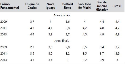 Ao se levar em conta o IDEB dos municípios nas últimas avaliações, nota-se uma situação educacional de risco, em que quase todas as avaliações situam-se abaixo das médias do Estado do Rio de Janeiro e do Brasil, conforme dados obtidos no portal do Fundo Nacional de Desenvolvimento da Educação (BRASIL, 2014) e expostos na Tabela 2.
