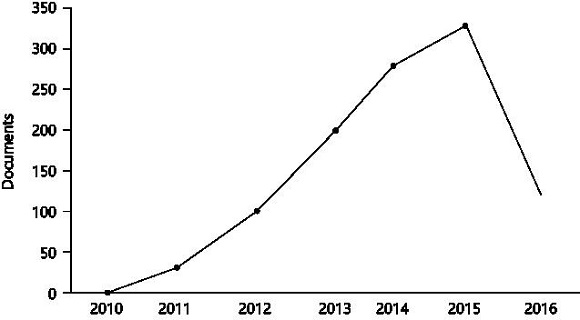 The search yielded 1384 documents which formed the first set of texts to be analyzed. Figure 2 shows the results of this initial searching with relation to the number of publications per year, indicating the increasing interest, emergence and novelty of this subject in the educational context.