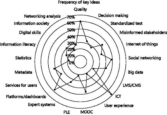 As a result of the processes of extraction, unification and categorization of data, 21 key ideas were found in three main groups: outdated education, data wastage and popularization. The first category included the following key ideas: quality issues (62,3%), decision making (35,7%), standardized tests (28,7%) and poorly informed stakeholders (41,4%). The second included: Internet of things (32,8%), social networking (47,4%), big data (39,8%), LMS/CMS (23,5%), ICT (67,9%), user experiences (20,5%), MOOC (45,7%) and Personal Learning Environments (21,9%). Finally, the third category included: expert systems (34,3%), platforms and dashboards (57,9%), end-user services (34,2%), metadata (40,5%), statistics (18,3%), information literacy (23,6%), digital skills (27,8%), information society (24,5%) and network analysis (27,8%).