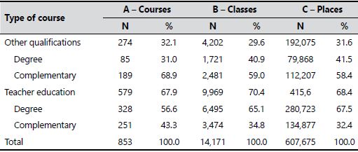 Comparisons among different kinds of qualification show that for each bachelor/technological course there were 3.8 times more teaching degree courses and the numbers for classes and places are 3.7 and 3.5, respectively. Applying the same treatment to the Complementary courses, we found less expressive numbers but they ratify the inducement to more teacher education: 1.3 times more courses, 1.4 times more classes and 1.2 times more places.