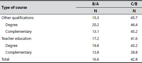 Considering these observations, can the percentage relations in Table 1 be considered ideal? Could they be improved? Supposing that the courses have similar qualifying potential, if the UAB were to redirect the institutional efforts, it would dedicate to Other Qualifications to teacher education instead, could the achievement of the primordial objective be expanded? We do not have the answers for now, but such questions suggest further studies.