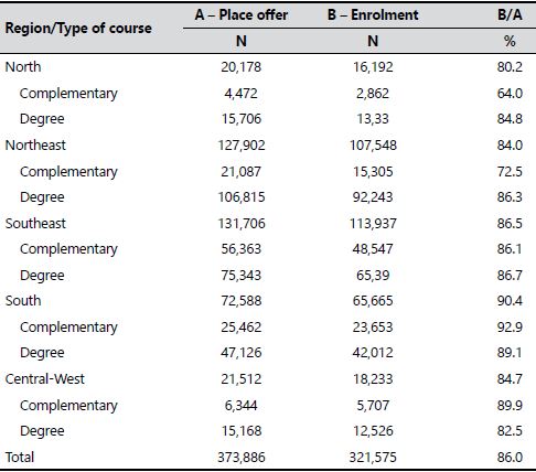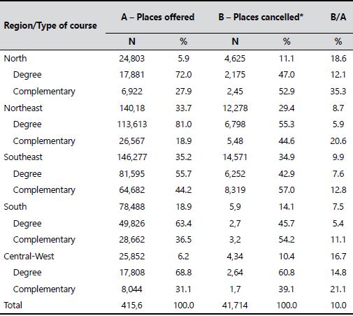 A complementary horizontal analysis of the same Table 3 – column B/A shows that, in principle, 10% of the places were lost. All regions cancelled places in complementary courses proportionally, 2.3 times more on average. North and Central-West presented the highest percentages of places not implemented, 18.6% and 16.7%, respectively. That fact differs from the conclusions of the horizontal analyses. In other words, those regions, with the lowest offer, were the ones that made least efficient use of their potential occupation. They did not even get to the point of setting in motion the selection process to occupy them.