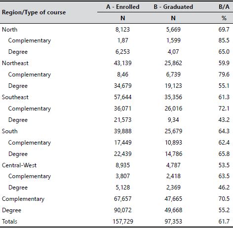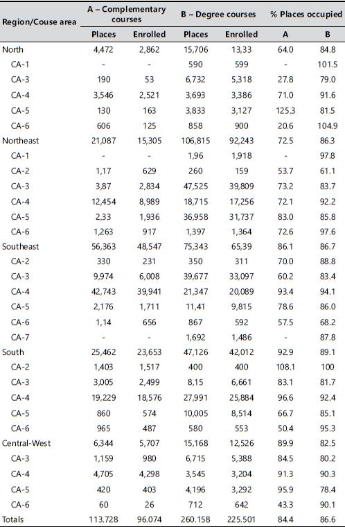 Vertical analysis of the Complementary Courses column reveals large allocation to Education, which accounted for 72.7% of the total number of places. The same is true for most of the regions with the lowest percentage being for the Northeast, 59%. Notably, the South and Central-Western regions respectively offered 2 and 1.3 times more complementary courses available than teaching degree courses. Thus, we can suppose, about complementary qualification, that the UAB channeled its efforts to offering opportunities for educators and professionals with other qualifications to acquire and improve their knowledge in the education field.