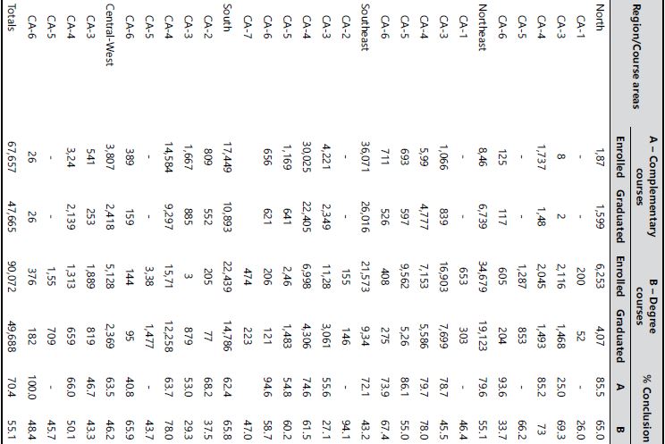 The analysis by area of qualification does not present a more encouraging scenario The course conclusion rates are modest and most negative among them are those for Sciences Mathematics and Computing where the mean percentage was 57.6% but for region North it was only 25%. The area of education shows a regular result of 72.1% and the highest absolute number of qualified graduates, 40,098 (84.1%). The Northeast also showed a regular result for graduation rate with none of the areas being lower than 70%.