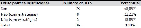 Cabe destacar que das 23 IFES, 82,16% declararam o tempo de existência da política institucional.