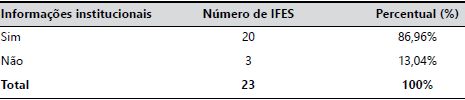 Na Tabela 10, observa-se que 86,96% das IFES declaram que informações institucionais tais como relatórios de gestão, relatórios gerados pela Comissão Própria de Avaliação (CPA), conforme disposto na Lei nº 10.861 de 14/04/2004, do Sistema Nacional de Avaliação da Educação Superior (Sinaes) ( BRASIL, 2004 ) e outros documentos são utilizados para a definição de política de formação continuada. Somente 13,04% não utilizam informações institucionais para a definição de sua política.
