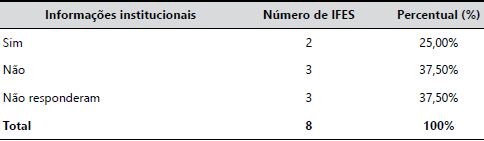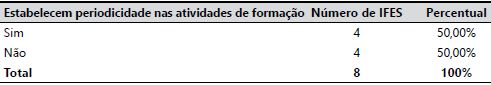 Quanto às IFES, que declararam não ter uma política institucional de formação continuada para os docentes, mas que já possuem estratégias para a sua implantação, somente duas delas declararam a periodicidade das atividades, ou seja, a política institucional ocorre semestral ou trimestralmente.