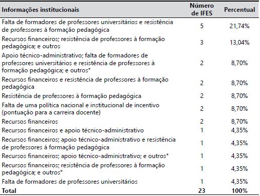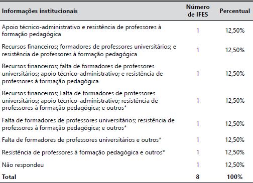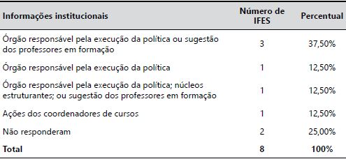 O número de instituições que têm uma política institucional de formação de professores converge para as conclusões de Fullan e Hargreaves (2000) ao afirmarem que tem sido exigido da universidade uma mudança/inovação quanto ao seu papel, qual seja, a de uma instituição organizacional aprendente, entendida como um terreno fértil às colaborações efetivas e à qualificação não somente daqueles que nela estudam, mas também para os que nela ensinam.