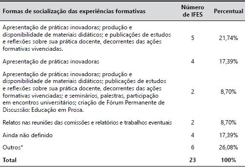 Foi realizado um levantamento, junto aos professores e estudantes de modo a oferecer subsídios e mapear as reais demandas da Universidade. As ações ainda são experimentais, estão em curso e pretendemos utilizar as diversas informações para a constituição do Programa de Ações formativas para a docência no-para o Ensino Superior em nossa instituição (IFES 17).