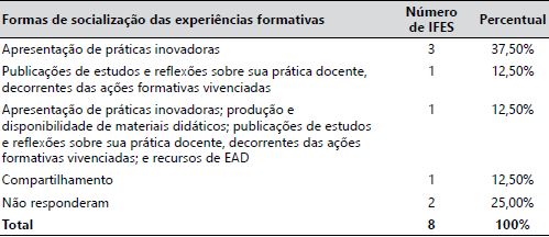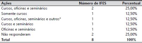 Também nas ações oferecidas pelas IFES que já pensam atividades de formação continuada não são observadas ações convergentes entre as instituições participantes do estudo, Tabela 7.1.