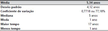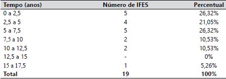 Nas Tabelas 2 e 2.1, observa-se que aproximadamente 50% das IFES têm cinco anos ou menos de uma política institucional de formação continuada para os docentes, corroborado pelo valor da mediana. O coeficiente de variação (0,7718) determina que os tempos de duração da política se mostram dispersos, o que ainda pode ser observado quanto ao maior tempo (17 anos) e quanto ao menor tempo (1 ano).
