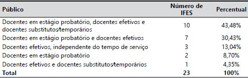 Outras 43,48% das IFES concentram-se em pensar uma política somente para os docentes efetivos, independentemente do tempo de serviço (com ou sem terem cumprido o tempo do estágio probatório).