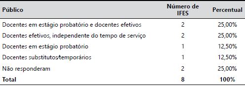A Tabela 3 apresenta o público-alvo a que se destina a formação continuada nas IFES participantes desta pesquisa. Destaca-se o percentual de 43,48% das IFES que consideram que todos os professores da instituição façam parte do programa, quais sejam: