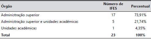 Observa-se na Tabela 4 que a maioria das IFES, 73,91%, responsabiliza a administração superior da instituição como órgão pela execução da política de formação continuada. Ainda 21,74% das IFES dividem esta responsabilidade entre a administração superior e as unidades acadêmicas que estão mais próximas aos docentes e às suas necessidades.