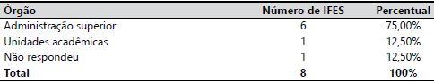 Acompanhando as IFES que já têm implantada essa política, na Tabela 4.1, observa-se que também a maioria das IFES, 75,00%, responsabilizaria a administração superior da instituição como órgão pela execução da política de formação continuada. Não há um pensar em dividir essa responsabilidade com as unidades acadêmicas.